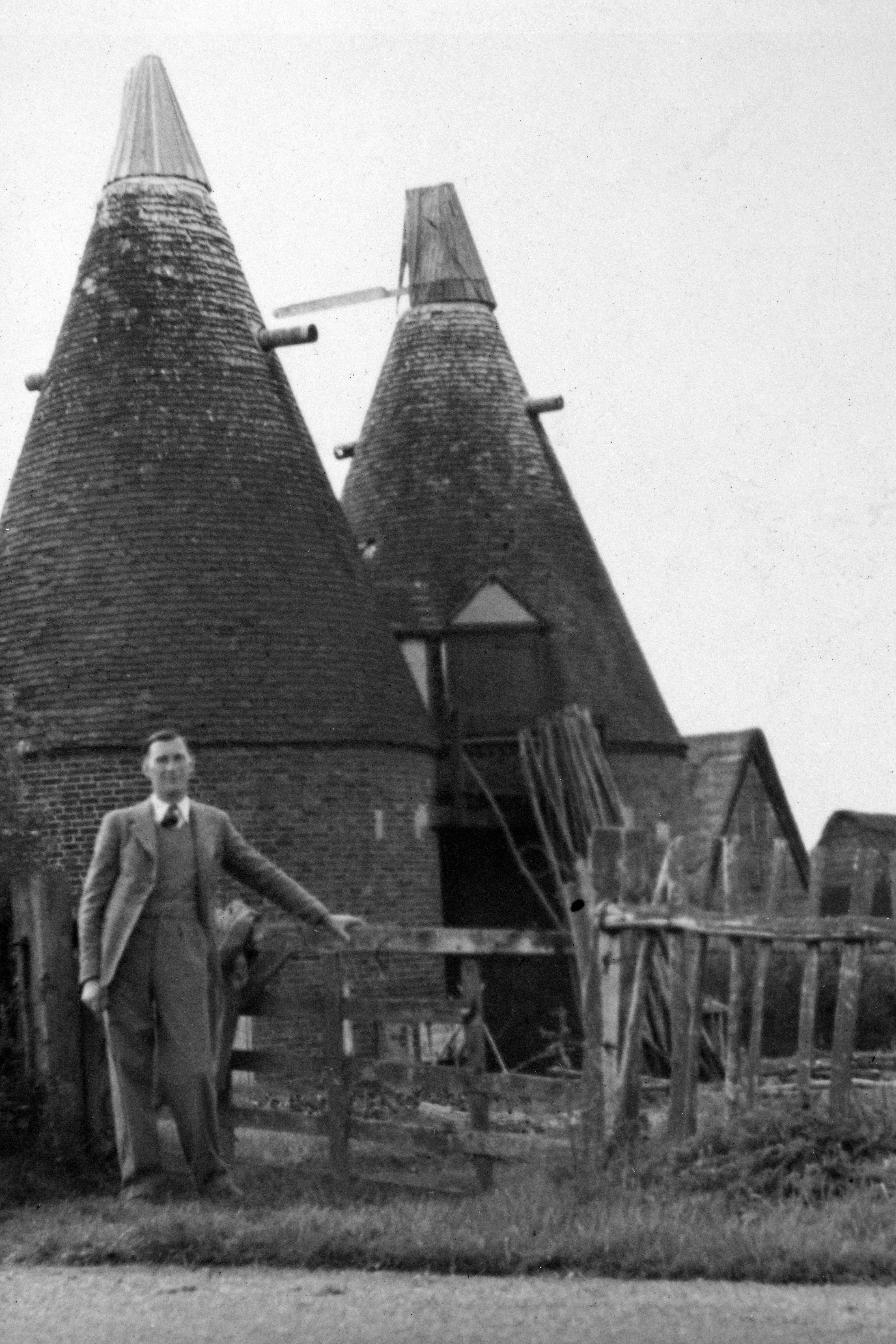 Man by oasthouses