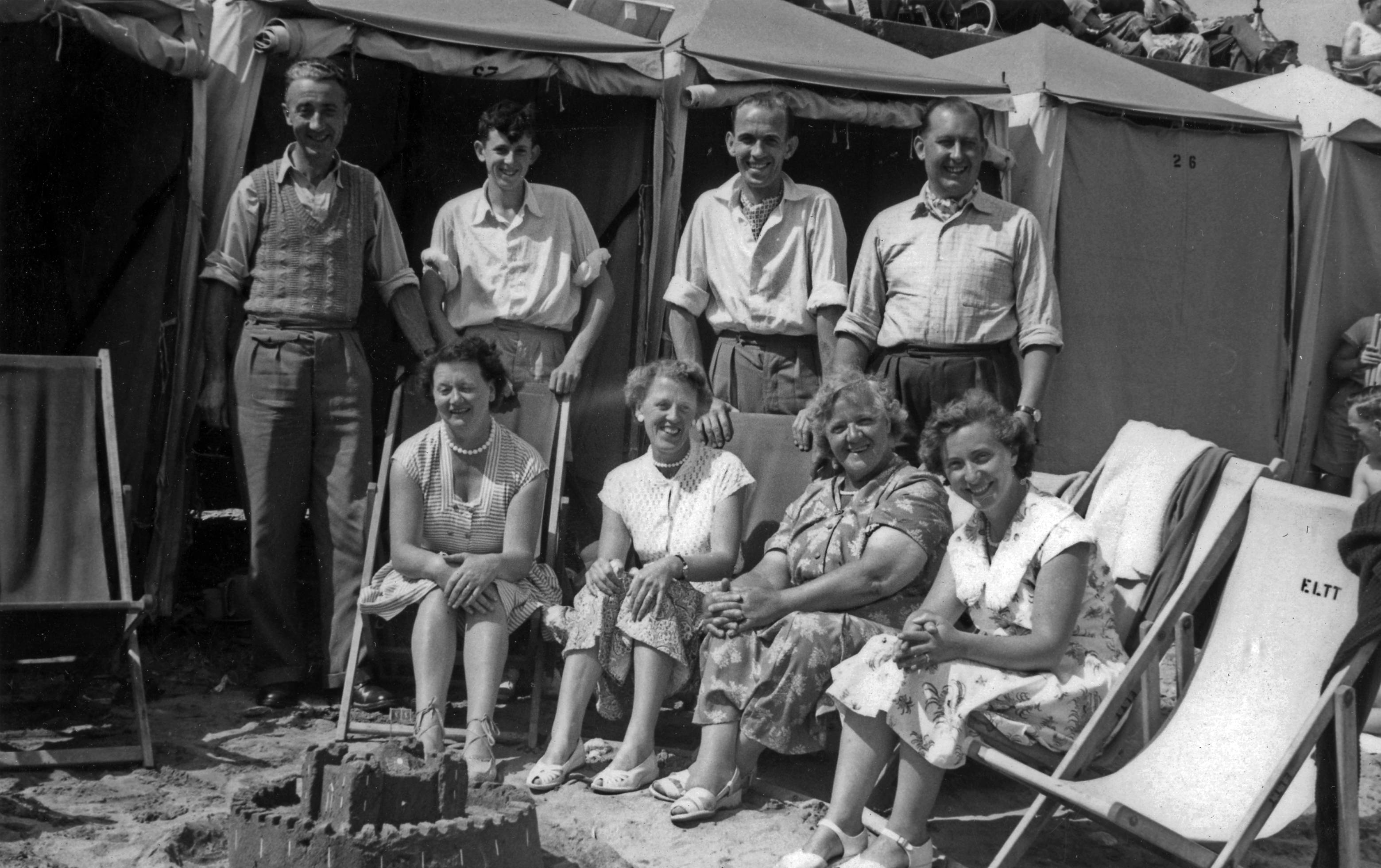 Lillian and Bernard Caswell on beach with family