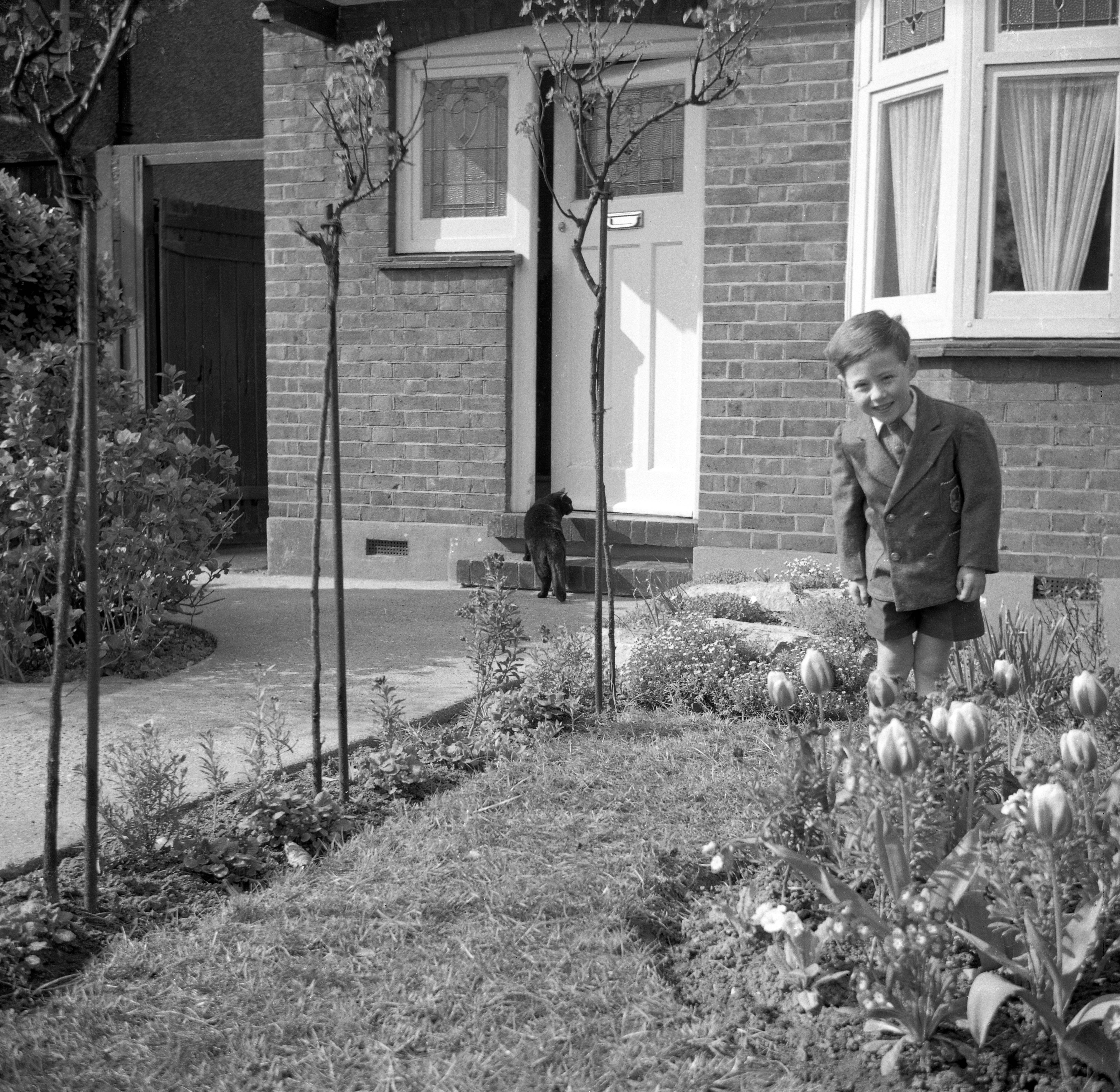 Stephen in front garden with Timmy