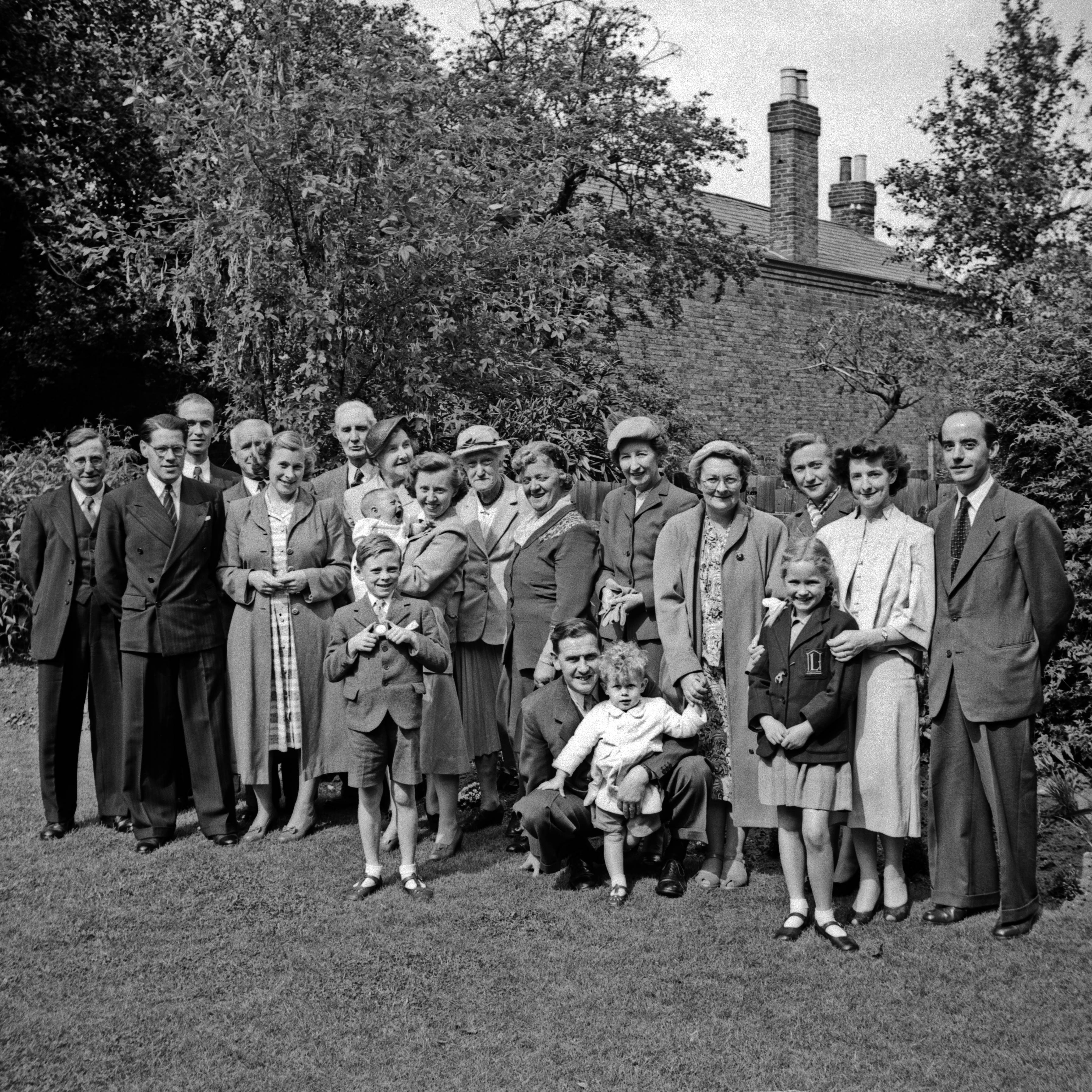 I can't be certain that this is my christening at St. Mark's, Surbiton, although the mix of family members would match that occasion. From left, top row: Ted Porter, Cyril Baker, Bernard Caswell, unknown man, Jean Baker, Fred Bishop, unknown woman, Doris Bishop holding baby Stephen, Mary Winifred ("Auntie Winnie") Wyatt (?), Lillian Porter, Annie Joyce Wyatt (?), unknown woman, Lillian Caswell, Florry Howe, Harry Howe; bottom row: unknown boy, unknown man holding unknown toddler, unknown girl.
