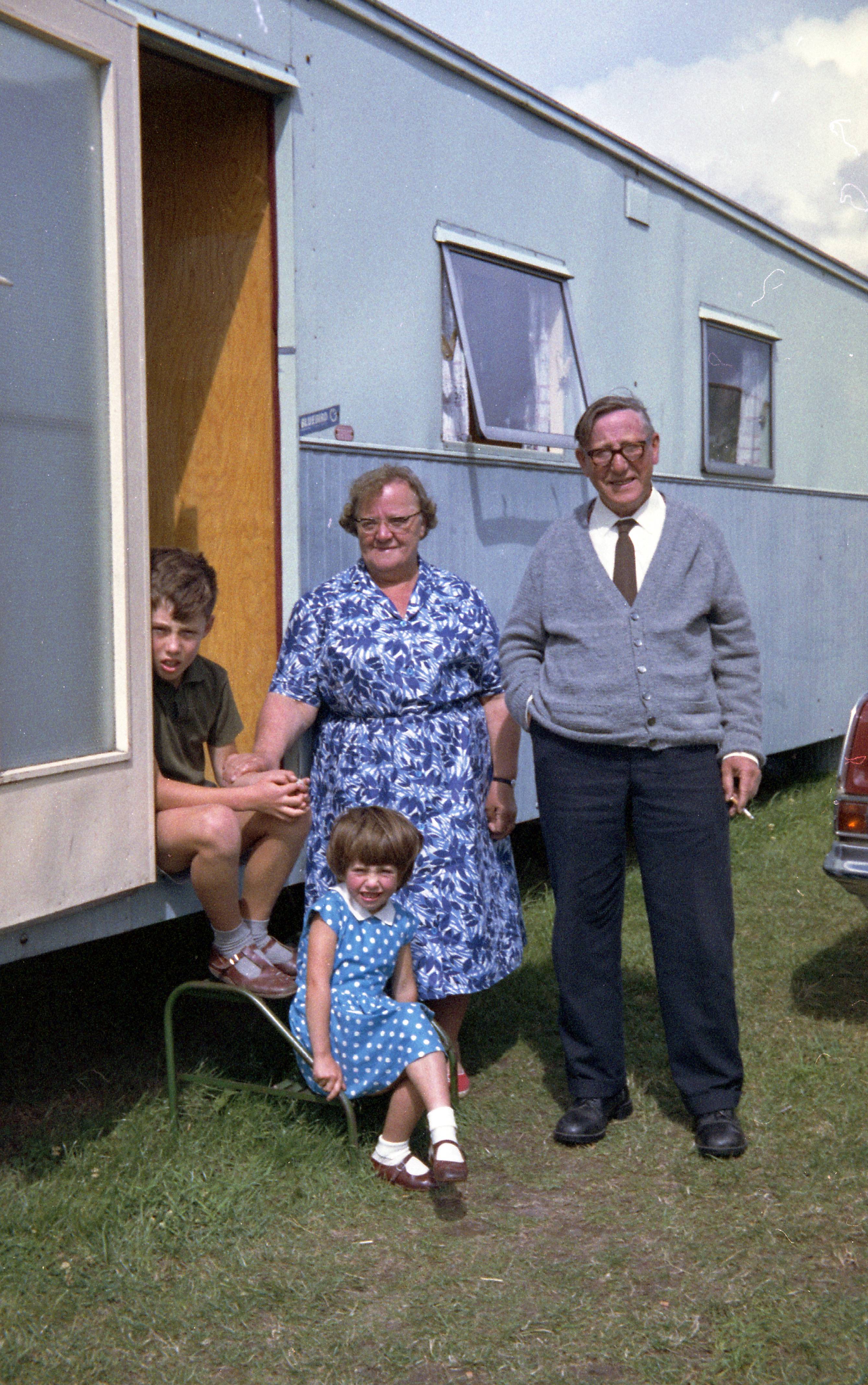 Stephen, Julia, Lillian and Ted Porter by the Caswells' caravan, Yarmouth